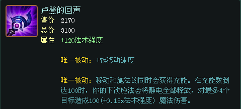 卢登的回声和巫妖之祸都有着移动速度加成,让一些对于移动速度需求很大的AP英雄有极高的适用性,并且高法术强度的装备也保证了技能伤害,例如崔斯特这种需要很强的机动性非常适合这两件装备的组合。